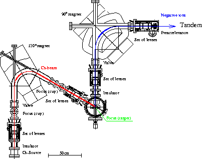 The positive Cs ions get produced by surface ionization on a 1200° C hot tungsten ionizer. The Cs beam is extracted and